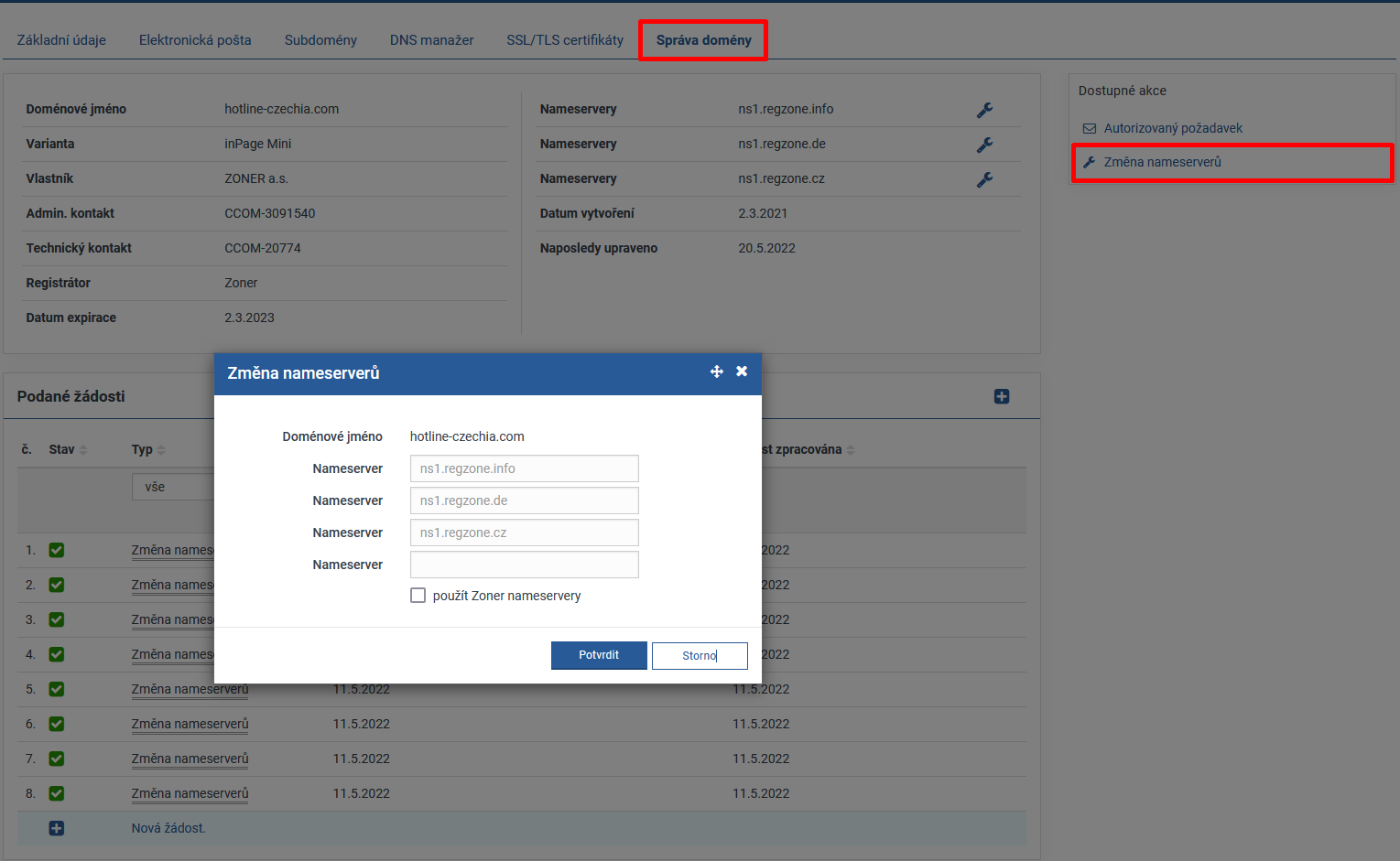 V detailu domény zvolíte záložku Správa domény, kliknete na odkaz Změna nameserverů a zadáte požadované nameservery. Pro dokončení změny nameserverů klikněte na tlačítko Potvrdit.